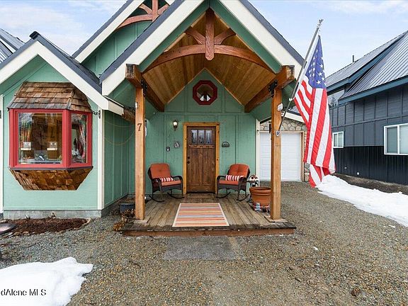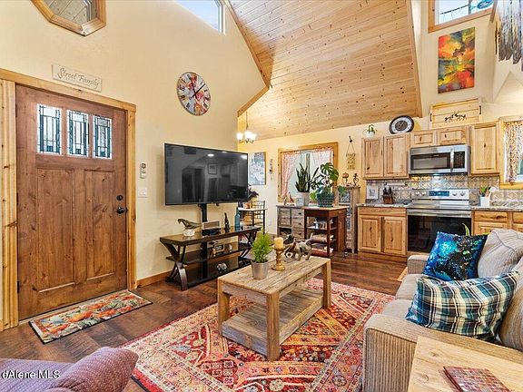 Property has already been inspected and appraised! Experience the breathtaking views of Scotchman Peak & the Idaho Panhandle National Forests! Located near Lake Pend Oreille for boaters & water lovers, Schweitzer for skiers, & Sandpoint for shopping & dining! This community enjoys extensive grassy areas, a pond area with picnic tables & a large area reserved for parking, boats & RVs. Come home to the peaceful, covered front porch with bay windows for watching the sunsets & snowfall. Watch the wildlife from the fully fenced backyard while working in the garden or appreciating all of the Spring blooms! Inside, the home has well placed windows allowing for plenty of natural light. The open floor plan & soaring pine ceilings give the home plenty of space. The downstairs bedroom has a large picture window looking out towards the nearby mountains & one full bath. The loft has barn doors & generous storage not to mention the stellar views of the mountain.
