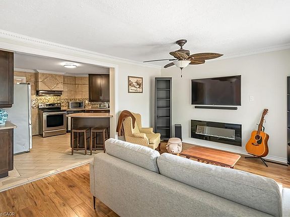 Detached bungalowThree bedroomsSpacious five-piece bathroomNewer asphalt drivewayOpen-concept layoutElectric fireplaceModern kitchen