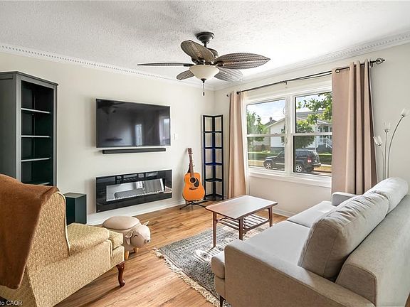 Fantastic detached bungalow located in central St. Catharines offering over 1,000 sqft. of comfortable main floor living. This well maintained home features three bedrooms and a spacious five-piece bathroom. A newer asphalt driveway accommodates 2+ vehicles. Inside, the open-concept layout includes a bright living room with electric fireplace, seamlessly mounted T.V. and sound bar. A modern kitchen with a breakfast bar and stainless steel appliances is a great touch to the space. Just off the living room, you'll find a versatile bedroom currently used as a home office. At the rear of the home, the large primary bedroom offers double closets, while the third bedroom is also generously sized. The large laundry room, with direct access to the backyard and the driveway, sits alongside the five-piece bathroom. While there is no full-height basement, a separate staircase in the laundry room leads to a utility area with 5 ft ceilings making it ideal for storage and housing the furnace and mechanicals. The fully fenced backyard is a true highlight, featuring a freshly painted deck with pergola, spacious lawn, fire pit and two garden sheds. Conveniently located close to shopping, schools, and highway access, this property delivers excellent value and convenience.