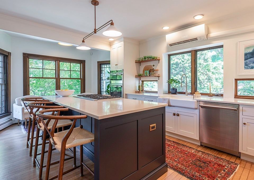 Nestled at the end of a quiet lane on nearly two acres in scenic Magnolia, this 1880 Queen Anne shingle-style residence provides the perfect blend of privacy, elegance, and comfort. Set high on Long Hill, the home has been beautifully updated while preserving its period charm and craftsman quality, including custom built-ins & window seats, 5 fireplaces, and a wraparound porch ideal for listening to the surf break on nearby Magnolia Beach. With 5 bedrooms and 4 bathrooms, it has over 4,000 sf of living space on two levels, so hosting family and guests is as easy as the breeze off the sea. A renovated chef’s kitchen anchors the main level, complemented by a sun-filled dining area, living room, family room, rec room/office & laundry. The upper level has a primary bedroom suite, four more bedrooms; one currently a den/TV room. Outside, a flagstone patio and firepit assure full enjoyment of the North Shore lifestyle—all just moments from the village, beach and trails of Ravenswood.