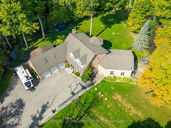 Remarkable country home! Stunning private setting with a waterfall feature, pond, surrounded by Harwood forest. Large family home, with upgraded flooring throughout, newly renovated kitchen with induction cooktop, large centre island and eating area, open concept dining area overlooking kitchen with a large pantry area. Main floor family room with wood burning fireplace, large front living room, wrap around deck off kitchen, Huge great room with in floor heating, soaring ceiling, fireplace and loads of natural light, walkout to a stone patio with waterfall feature, outdoor fireplace, and a enclosed gazebo ...great for entertaining! 4 large bedrooms with renovated ensuite bath and 4pc bath, loft area over garage is perfect for home office or craft room. Unfinished w/o basement. Car enthusiast dream 3 garage with both heating and air conditioning!!! Large storage shed off garage. Fantastic fenced in backyard, with a pond (great for skating in the winter), separate detached single car garage. Large paved driveway with loads of parking. Generac Generator large enough to power whole house! Rogers High Speed internet service, and natural gas.