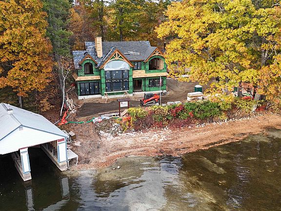 This new construction Adirondack-style home by Cargill Construction offers unparalleled lakefront living on the shores of Lake Winnipesaukee. Thoughtfully designed to blend luxury craftsmanship with natural beauty, this residence will feature lake and mountain views, a private setting, and top-tier finishes. Inside, a vaulted two-story great room with wood beam ceilings and a two-story stone gas fireplace sets the tone for an inviting yet elegant space. The home is designed for effortless year-round enjoyment, with a 4-season porch and an elevator providing seamless access to the upper level. The thoughtfully planned layout includes two ensuite bedrooms, an additional bedroom, and a spacious bonus room above the garage with custom built-in bunk beds. Set on a beautifully landscaped lot, this property boasts 145+/- feet of pristine shoreline, a sandy walk-in beach, and coveted southwest exposure, ensuring all-day sun and breathtaking sunsets. A double-bay boathouse is set to be remodeled, complemented by an additional seasonal dock, making this a boater’s paradise. The outdoor living experience is equally impressive, with tiered patios, bluestone walkways, a fire boulder, and custom outdoor lighting enhancing the natural beauty and tranquility of the setting. Privacy abounds, with fencing on two sides and a picturesque running brook bordering the property. Construction underway. Agent is the seller