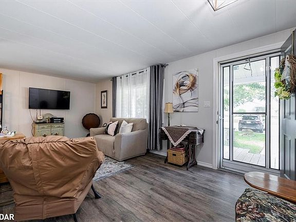 Welcome to your new home. Located in the vibrant adult community of Sandycove Acres South conveniently located close to the community hall, swimming pool and local plaza. This clean and bright 2 bedroom, 1 bath Simcoe model features an 874 sq. ft. floor plan. The home’s exterior is vinyl siding and has a covered front porch and side entrance along with a garden shed. The interior is painted in a light neutral gray with an updated kitchen, laminate flooring, newer windows, new furnace and A/C unit (2023), updated switches and outlets, add-on sunroom with access to the rear yard green space. The bathroom has a new toilet, sink and taps. The two front yard parking spaces provide easy access to the entrance of the home. Sandycove Acres is close to Lake Simcoe, Innisfil Beach Park, Alcona, Stroud, Barrie and HWY 400. There are many groups and activities to participate in along with 2 heated outdoor pools, 3 community halls, wood shop, games room, fitness center, and outdoor shuffleboard and pickle ball courts. New assumed lease fees are $586.53/mo. and $141.69 /mo. taxes. Come visit your home to stay and book your showing today.