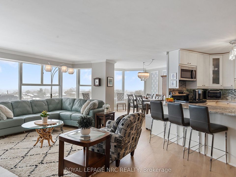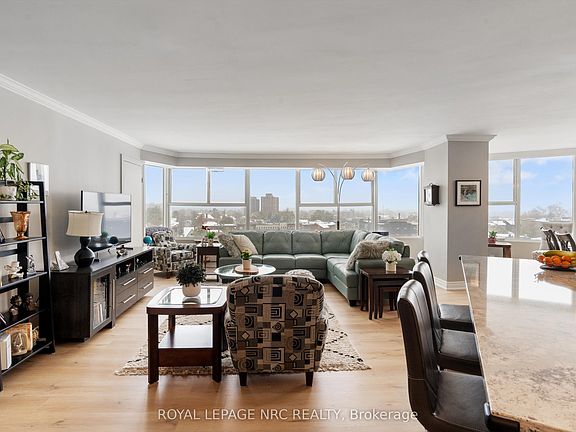 Beautifully renovated 1,157 sq. ft. 2 bedroom and 2 full bathroom condo with luxury finishes and stunning views. This redesigned open-concept suite features all new stylish flooring, non-slip slate and tile, crown molding, custom doors, custom kitchen featuring Caesarstone counters, stainless steel appliances, and a custom walkthrough closet with in-suite laundry. Carpet-free and move-in ready. The building features indoor pool, gym, saunas, games and party rooms, workshop, car wash, and observatory. Centrally located near Hwy 406, downtown, shopping, Meridian Centre, and Brock University. Nothing to do but move in and enjoy!