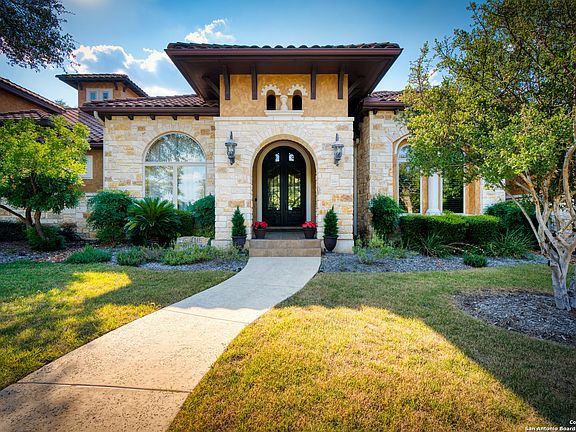 Nestled within the prestigious Cordillera Ranch community, this magnificent 4-bedroom, 4.5-bathroom residence at 7 Granadilla exemplifies sophisticated living at its finest. Spanning an impressive 5,898 square feet, this newly listed home showcases extraordinary architectural details and premium finishes throughout its thoughtfully designed spaces. The heart of this remarkable home features a gourmet kitchen adorned with a substantial island and generous sitting bar area, complemented by a butler's pantry for seamless entertaining. The eat in nook area invites you to look out at the serene views to the pool, patios and legacy oak trees through seamless glass.The formal dining room presents wrought iron accented doors leading to an elegant wine enclave, creating an atmosphere perfect for memorable gatherings. The generous and dramatic living room invites conversations by the soaring fireplace. Large enough to entertain many family members and guests but yet comfortable enough to curl up and enjoy just relaxing. A large office commands attention with meticulously crafted built-ins and distinctive wood accented ceilings, providing an inspiring workspace for discerning professionals. The spacious primary bedroom retreat offers luxurious accommodations with an opulent bathroom and an additional workout room for ultimate convenience. An ensuite guest bedroom positioned on the main level ensures comfort and privacy for visitors, while the upper level houses two additional bedrooms and bathrooms alongside an expansive living area featuring a bar space ideal for multi-generational entertainment. The exterior grounds transform into a private backyard oasis featuring multiple patio areas, a fireplace sitting area, sparkling pool, and outdoor kitchen beneath magnificent oak trees that provide natural privacy, cooling shade, and serene ambiance. The oversized four-car garage offers abundant storage and parking solutions. This gated and fenced property provides dual entry gates for convenient access while maintaining security and exclusivity. The home's location offers close proximity to the Farm to Market Road 3351 gate and swift access to Cordillera Ranch's pristine park and river areas. Residents enjoy unparalleled community amenities including an elegant clubhouse, restaurants, tennis and pickleball courts, comprehensive fitness center, shooting and archery facilities, equestrian center, and scenic nature trails for peaceful walks. Every element of this sophisticated and dramatic residence reflects meticulous attention to detail, with tremendous storage throughout ensuring practical luxury living. The property represents an extraordinary opportunity to experience the refined lifestyle that Cordillera Ranch provides, combining natural beauty with world-class amenities in one of Texas Hill Country's most coveted communities.