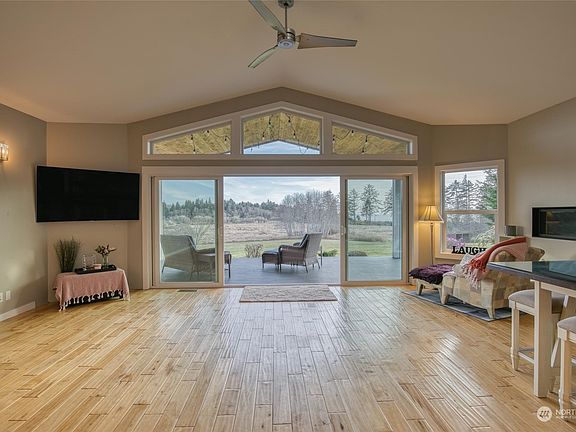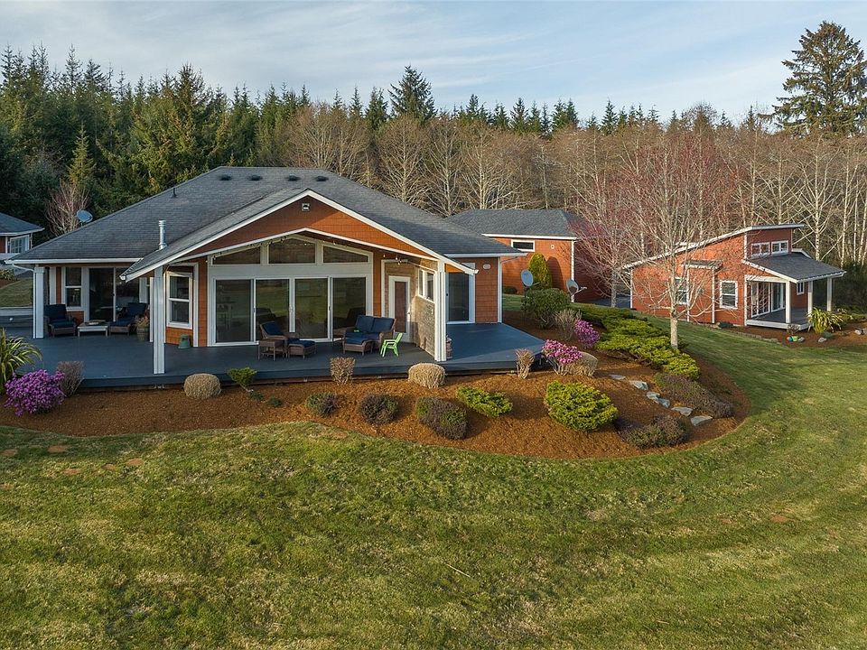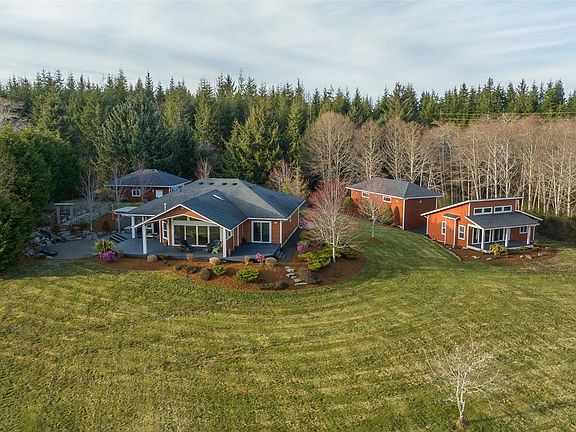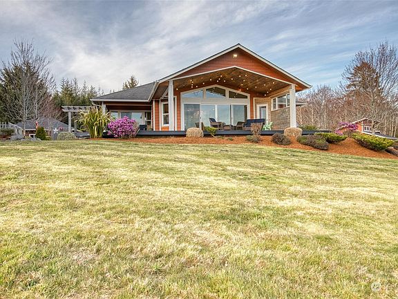 Amazing Bay views from this Bay Front property on 13 acres. This one-level 3 bedroom, 2 bath home features over 2,000SF and includes a primary suite with a five piece bath, walk-in closet and sliding glass door with access to back deck and patio with hot tub. An open concept living room and kitchen with eat-in bar and dining area. A large sliding glass door along with lots of windows provide your amazing view and leads to a covered back porch. Along with a 2 car attached garage there is an additional detached garage and RV garage. The casita/office/studio offers an additional 3/4 bath and garage. Mature landscaping and garden space add to the unique property.