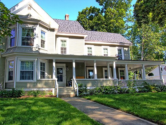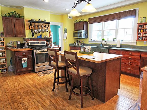 The main house 1st floor has an open concept living space via two sets of historic pocket doors that allow for easy access between all rooms. The large kitchen has new appliances, wood cabinets, unique slate countertops and center island with bar seating. Off the kitchen is a heated entryway, a laundry room and 1/2 bath. New hardwood staircase to the 2nd floor opens up to a 4 bedroom, 2 bath layout with unique hallways and stair balcony. A finished, carpeted 3rd floor can be used for recreation/sleeping. A large insulated storage area is also located on the 3rd floor.