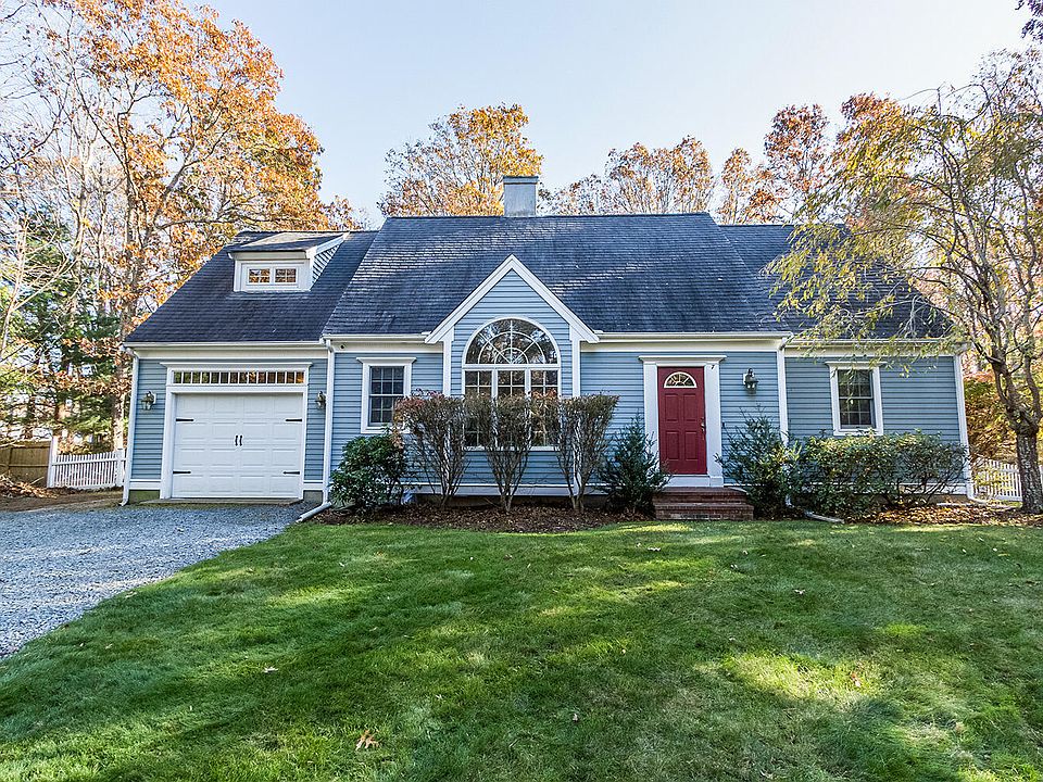 Set on a private and quiet cul-de-sac in a very desirable neighborhood, this 3 bedroom and 2.5 bath home features a first floor master bedroom and private bath. The open concept with Palladian window and vaulted ceiling is convenient to golf course, conservation land and only minutes to Mashpee Commons, Sandwich Village, and local beaches and ponds for recreational fun. The formal dining room with wood floors opens through French Doors to the Living room, and expands to the mahogany deck , stone patio and level yard beyond which is perfect for entertaining. The sun lit kitchen offers stainless gas range, appliances, and large breakfast bar. Two second floor bedrooms sharing a generous bath with an open loft area and home office with French doors complete the second floor.
