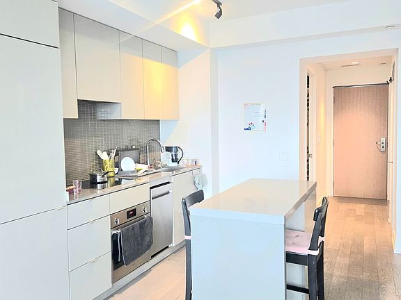 Airy and modern 1-bedroom + den unit at the luxury YC Condos, located in a highly sought-after area of Downtown. Features a functional layout, floor-to-ceiling windows, and an oversized balcony with stunning views from both the living room and bedroom, 9' ceilings, laminate flooring throughout, and a den with a sliding door and closet, suitable for use as a second bedroom, and a modern kitchen with an island.Resort-style amenities include a gym, infinity pool, outdoor terrace with BBQs, visitor parking, and 24/7 concierge. Steps to the TTC, Loblaws, U of T, TMU, Eaton Centre, hospitals, and parks.