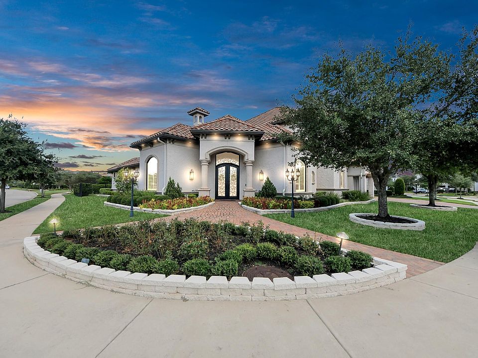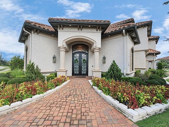 LUXURIOUS CUSTOM HOME situated in the ULTRA-EXCLUSIVE, GATED COMMUNITY of Majestic Point at Riverstone! This FORMER MODEL HOME built by Westport Homes is LOADED W/UPGRADES!! Situated on a prime corner lot with no back neighbor, this home will impress from the moment you arrive. Double iron doors lead to a WORLD OF LUXURY with gorgeous stone floors & endless crystal chandeliers. Gorgeous living room with SOARING ceilings, stone fireplace and open concept living! Fantastic floor plan with 2 bedrooms down! Elegant formal dining is perfect for entertaining! Incredible kitchen with custom cabinetry and high end appliances. The study could also be a forma living area. Luxurious primary suite w/spa-like bathroom and 2 closets. Upstairs features a large game rm, media, and 3 suites with private bathrooms and balcony overlooking the backyard and greenbelt. Incredible schools, world-class shopping and fine dining nearby! Call the AIDA YOUNIS TEAM today!