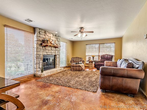 You’ll be impressed by the stained concrete flooring and beautiful driveway. Inside discover low maintenance concrete floors and stunning all-wood hickory doors and trim. The spacious living room is anchored by a magnificent large, wood burning rock fireplace, perfectly positioned to offer breathtaking views of Lake Eufaula from every angle. The kitchen features stainless steel appliances, granite countertops, and a sleek stainless steel sink.
