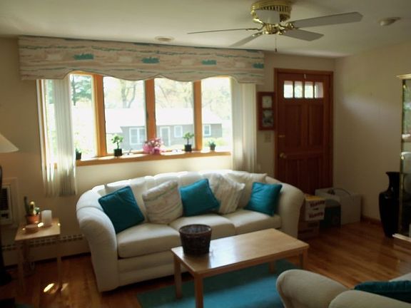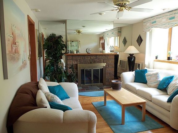 Very well maintained ranch features hardwood floors in 3 bedrooms & living room. Ceiling fans in all 6 rooms, recess lighting in kitchen & living room, updated bath 3 years ago, 2 A/C wall units. Furnace less than 2 years old. Partially finished basement, fireplace living room. Beautiful 4 season sun room (heated) with wall to wall carpet and windows on 3 sides. 3 zone heating. Large corner lot with car port. Easy commute to Rt. 93.