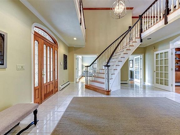 Step into this beautiful custom designed contemporary Colonial with unique and expansive floor plan. The newly painted, neutral color palette creates lightness and openness. The entry foyer has a dramatic curved staircase with an open balcony walkway. Just beyond the foyer through French doors is a stunning family room with gleaming hardwoods, wood burning fireplace, cathedral ceiling and wall of windows. The nearby center island has newly painted cabinets, new granite, new lighting and skylights over the breakast area. Also off the kitchen is a lovely, spacious dining room. Adding to the first floor is a formal living room, private library with fireplace, and nearby newly carpeted media entertainment room and a tiled sunroom with glass doors leading to a large outside deck. A whimsical touch in a spiral staircase leading up to the master suite. In addition, there is a conveniently located laundry room, powder room, and a terrific bonus room for home gym, playroom or storage over the 3 car garage. The second level has a private master suite with balcony, fireplace, walk-in-closet, and an updated master bath. There are 3 more bedrooms and 2 full baths. This home is pefect for grand entertaining and every possible amenity.