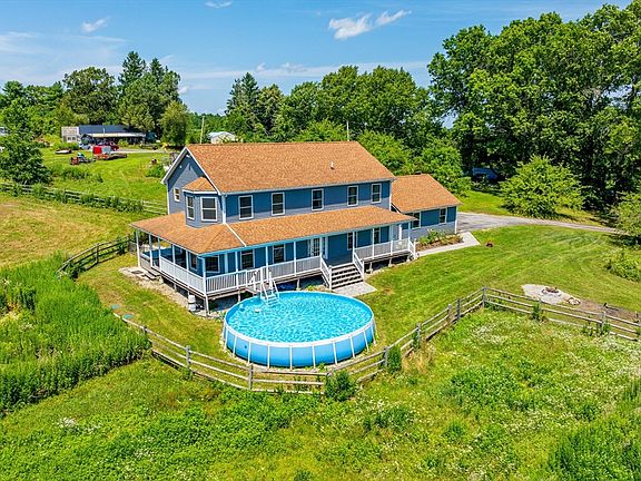Welcome home to the farmhouse of your dreams sitting on 6.8 acres of land with incredible views from every angle. Upon entering the front door you are greeted with a wrap around front porch that leads into your open floor plan kitchen and living room. The spacious kitchen offers plenty of storage, an island, stainless steel appliances, room for a dining table and transitions into your living room entertainment space. The hardwood floors, window and slider lined walls will be sure to capture your attention. Downstairs is finished off with a home office, bathroom, large mudroom and oversized two car garage. Upstairs you will find 3 bedrooms, plus the master suite with a sizable walk in closet and ensuite bathroom. The second full bathroom has 3 vanities and two showers! No need to share spaces getting ready! Laundry is also conveniently located upstairs. The basement offers high ceilings and fantastic extra storage. Outside is a dream with your pool, hot tub, barn and acres of privacy!