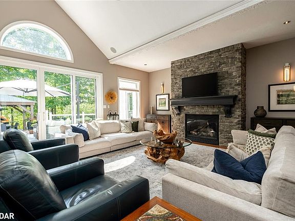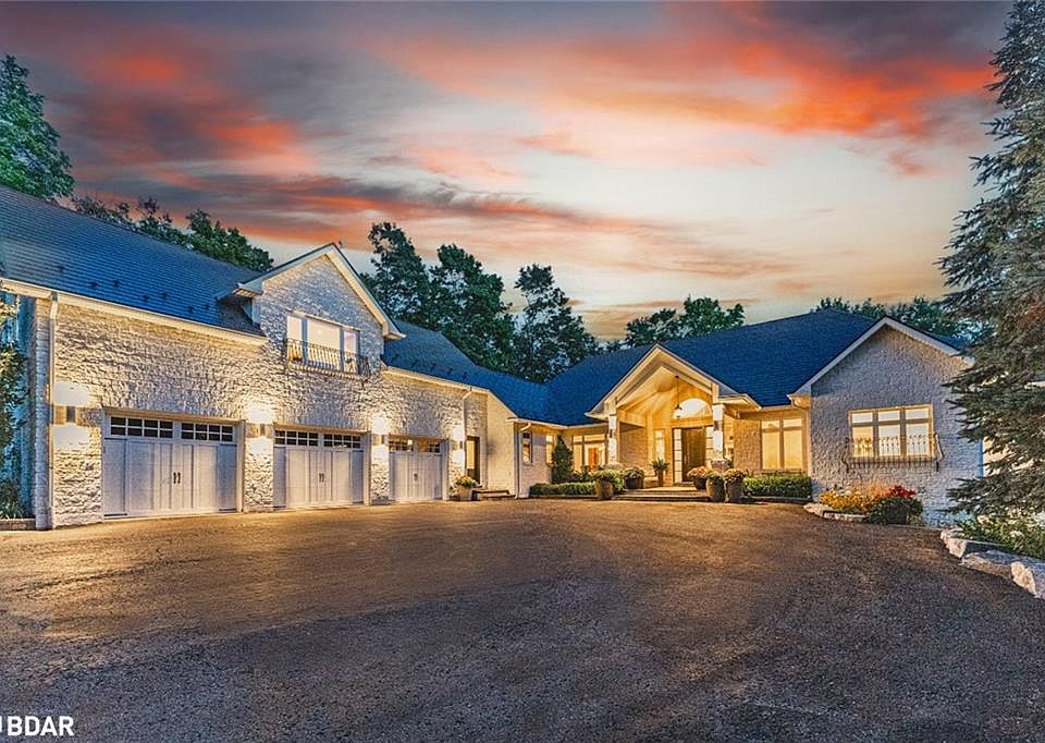 8,000 + SQ FT ESTATE ON 1.33 ACRES WITH RESORT STYLE BACKYARD, POOL, HOT TUB, TRIPLE CAR GARAGE & ADDITIONAL LIVING QUARTERS! Situated in one of Oro-Medonte’s most prestigious enclaves, this bungalow offers over 8,000 sq ft on 1.33 acres of landscaped grounds with a stately stone exterior. A long driveway provides parking for 16, complemented by a heated 3-car garage with a lift for 4 car capacity and an EV charger. Soaring ceilings, refined craftsmanship and designer finishes define the home. The chef’s kitchen impresses with solid wood cabinetry, a massive island, premium appliances, including a $24k Thermador range, while a breakfast nook captures serene forest views. A dining room with a custom-built-in cabinet is perfect for entertaining, and the living room features a stone fireplace and walkout. The primary offers 2 walk-in closets, a walkout to the pool and an ensuite with heated floors, soaker tub, and glass-walled shower. 2 additional bedrooms share a 4-piece bath, with a powder room, laundry and mudroom completing the level. The walkout basement boasts 3 additional bedrooms, including one with a semi-ensuite 4-piece bath, a 2-piece bath, a spacious den/craft room, and a rec room featuring a double-sided fireplace, wet bar, pool table, and games area, and a walkout to the backyard. Above the garage, a private living area with a separate entrance includes a kitchen, living and dining space, bedroom, laundry hookups, and independent heating/cooling. The backyard presents an inground saltwater pool with a waterfall, hot tub, pool house, gazebo, patio, and an 8-zone irrigation system. Upgrades include an aluminum roof (2018), 2 furnaces and 2 A/C units (2022), a generator (2022), Phantom Screens, powered window coverings, a Sonos sound system, wired security, high-end lighting, a striking glass and hardwood staircase and a 9’ x 14’ sliding glass wall. Minutes to golf, skiing and Lake Simcoe, less than 15 minutes to Barrie and approx. 1 hour to Pearson Airport.