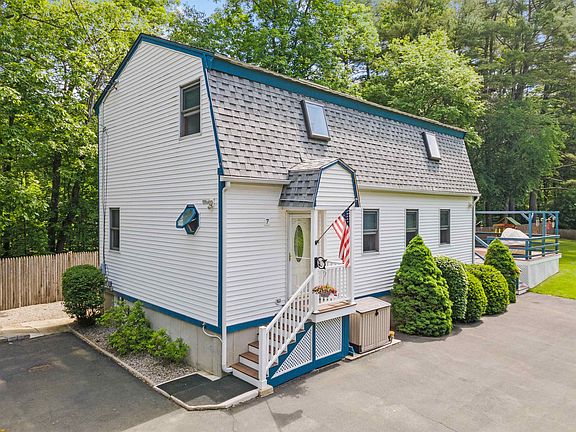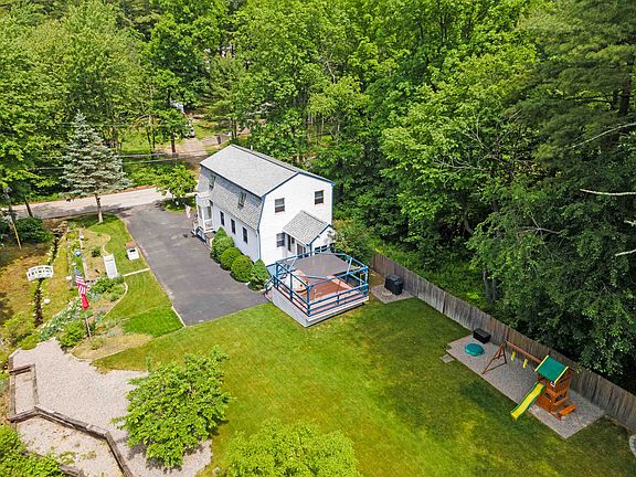 Meticulously Maintained Gorgeous Gambrel featuring open concept 1st floor with tiled entry, brand new half bathroom with granite countertop vanity, tile floor, bead board and crown molding, spacious living room with wide pine wood floors and gas fireplace open to excellent eat-in kitchen with slate finish appliances, tile floor, and dining area, lovely sunroom with tile floor cathedral ceiling, and office/study with wide pine wood floors. The 2nd floor includes a large primary bedroom with cathedral ceiling and walk-in closet, stunning remodeled full bathroom with quartz countertop vanity, wainscoting with tile inlay and vinyl plank flooring, and 2 more generously sized bedrooms. Plus, full finished basement with fantastic recreation room with pool table (included), dart section, media room, and unfinished area with laundry, utility sink, and storage space, replaced roof, central A/C, generator hookup, irrigation system, vinyl siding, town trash and recycling, big composite deck overlooking private backyard with lush manicured lawn, playset, firepit, 2 sheds and paved driveway all on great .60 acre lot with quick access to Route 125. See floorplan, 3D tour, video walk through and showing packet for additional info. Private showings by appointment welcome.