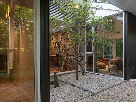 BEST OFFERS IN SEPTEMBER 11 MIDNIGHT DEADLINE. SELLERS PREFER NO ESCALLATION CLAUSES. Live authentically. Poised at the intersection of architectural brilliance and natural splendor, the Mid-Century Modern masterpiece crafted by the visionary architect Charles Richter redefines living with an artful harmony of design and the environment. This residence stands as an homage to the timeless design of the Mid-Century ethos while propelling it into the modern era. A central courtyard offers a serene oasis that transcends function to become a meditative sanctuary. An interplay of textures and elements unfold. The courtyard acts as a dynamic transition between the interior and the surrounding landscape. A space where light and shadow engage in a perpetual dance. The great room symphony of glass, wood, and stone. A commanding stone fireplace. Rises majestically from floor to ceiling, a symbol of warmth and unity. The natural hues of the stone echo the earth's palette, grounding the space. This harmonious union offers panoramic vistas of the courtyard’s serenity as well as a seamless connection to an expansive stone terrace with enchanting woodland views. The light and the gentle rustling of leaves are constant companions to the living experience. The alchemy of warm woods, purposeful proportions, carefully curated lines of sight, and expanses of glass create an iconic living sculpture. A vessel for life. A dining room that encourages convivial moments and thought-provoking conversations well into the evening. It is graced with a wall of exquisite built ins by the talented Edward Benesch. A peaceful primary suite, where your tranquil koi pond graces the space just beyond the window. The soothing melodies of water contribute to an atmosphere of serenity and contemplation. This private aquatic haven offers a source of calm. Beyond the aesthetic allure, this architectural masterpiece is also an embodiment of functionality. Effortless transitions between spaces, ergonomic layouts, and a sense of purposeful openness are the hallmark of Richter's genius. Cultivate your existence. Please book your appointment now. In the event the active date changes, you will be notified. The art of uniting human and home. Please do not visit without an appointment.