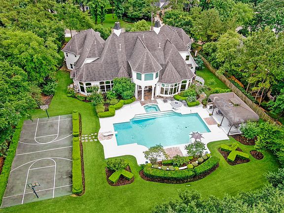 Temporary price reduction for as-is sale, and an opportunity to put your personal touch on this spectacular home. Home is awaiting remodel due to freeze damage in primary bed/bath/closet & garage. Act fast! One of a kind French Provincial estate home with lush landscaping and beautiful mature trees. Gated, private retreat offers a four-car garage, inviting pool, sport court with half tennis court, large patio with iron pergola, outdoor summer kitchen, and expansive yard! Incredible attention to detail and true to its French design, this home features extensive millwork, hardwood floors, wrought iron staircase, marble floors with inlay and a balanced, symmetrical floor plan. Oversized, primary suite overlooking the backyard oasis. Flexible floorplan includes oversized study, media room, game room, and extra flex room with ensuite bath. Walk to John Cooper school and Nature Preserve. Easy access to Woodlands Mall, Pavilion, and 1-45. This is a must see.