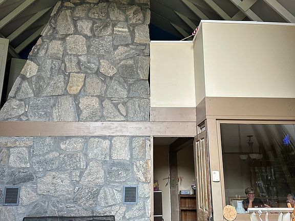 Stunning stone fireplaceSoaring spacesExposed structural elements