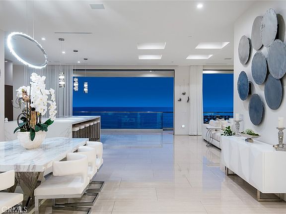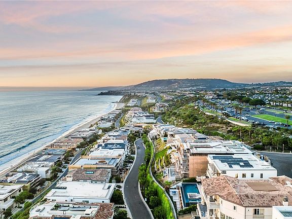 Recently constructed contemporary masterpiece in The Strand at Headlands - a coveted enclave located along the awe-inspiring Dana Point coastline. Sited behind the guard gates, the residence offers nearly 7,400 square feet of immaculately appointed, sleek interiors with an awe-inspiring exterior space, complete with one of the largest pools in the community. The straight-on views of the Pacific and Catalina Island begin at the entryway into this property, with its main level framed by two sets of full-height sliding glass doors spanning the length of the ocean-facing wall. Thoughtfully designed and executed, this floor offers the best in open entertaining space, with a glassed-in wine feature, living and dining areas, an office, and the home's impressive kitchen. Anchored by a bookmatched waterfall edge peninsula large enough to seat six, it boasts a cooktop and built-in coffee machine by Gaggengau, as well as a suite of Bosch appliances. Discreetly hidden, a large walk-in pantry maximizes the storage. Capitalizing on the views, the large balcony offers secondary dining and lounging areas. A modern floating staircase connects all three stories, with the upstairs dedicated to sleeping quarters. The soothing views of the Pacific extend to the primary retreat, complete with a balcony, a fireplace, and a sitting area. An expansive bathroom with a standalone ocean-facing tub, an oversized shower, and dual walk-in closets enhance the luxury of the owner's suite. Accessible by stairs and the home's elevator, the lowest level is the ultimate in California entertaining, with an impressive movie theater, a secondary living room, an Arabescato Corchia marble island, and beverage refrigerators. Blending seamlessly with the outdoors, this floor includes access to the impressive infinity edge pool with a spa, a conversation pit with a fire feature, and an outdoor kitchen. Offering privacy and convenience, the ensuite secondary bedrooms are found on both the upper and lowest levels. Property highlights include an elevator, interior and exterior security cameras, and a Control4 Smart Home system. Car enthusiasts will undoubtedly revel in the spacious four-car garage. The Strand is renowned for its residents-only amenities: a clubhouse with a pool, spa, and gym, as well as direct beach access.
