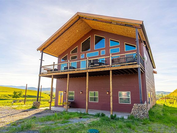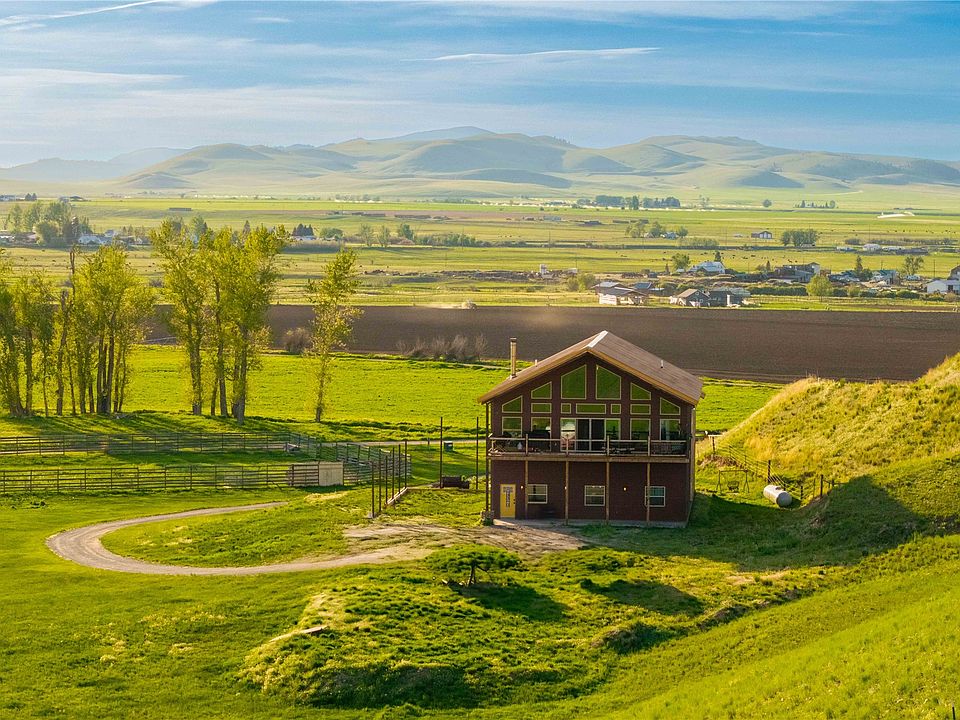 Discover this stunning, custom home nestled on 29 expansive acres in Hall, Montana. With over 5,500 square feet spread across three well-designed levels, this property seamlessly blends functionality and rustic style, making it ideal for families or anyone seeking a Montana lifestyle. Surrounded by majestic mountains and fertile farmland, the home offers spectacular summer views from the expansive deck and cozy winter views through the floor-to-ceiling windows.This residence is adorned with stylish custom features, such as alder wood cabinetry, solid wood doors, and three unique, rock vessel sinks that elevate the rustic character. The main floor boasts a large family room with additional space perfect for an office or gaming area, along with an attached apartment complete with laundry facilities. This flexible living space is perfect for multigenerational living, rental income, or as an exceptional guest suite. Upstairs, you will find the main living area that includes the kitchen, dining, and living room spaces. This level also consists of a guest bathroom, a spacious guest bedroom, and a laundry room. The primary suite on this floor is truly a retreat, offering a private balcony, an oversized walk-in shower, and a luxurious soaker tub, creating a serene oasis for relaxation.