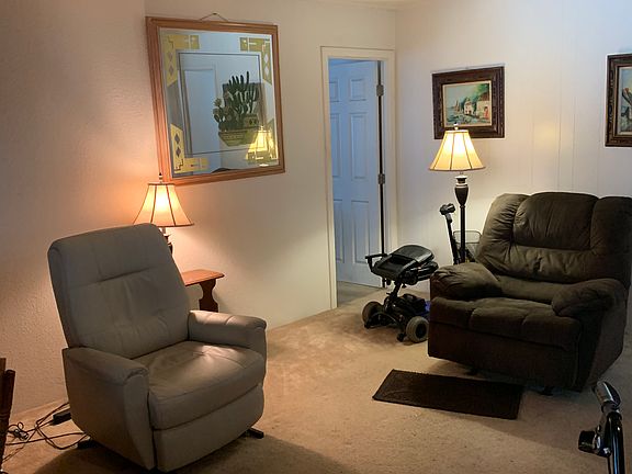 Spacious mobile home in the Bandera Estates 55+ Active Senior Community. It is located within walking distance to all the amenities of downtown Brea. This open space layout has a kitchen space that opens up into the family room and dining room. There is a large living room that opens to the large covered porch. The master bedroom is huge (approx 15 x 18) and features a large walk-in closet 9 ft 6 x 6 ft 8. The master bath includes a sunken tub plus walk-in shower and double vanity. There is an individual laundry room with doors to the carport or 2nd bedroom. The 3rd bedroom/sunroom has French doors that open to the covered porch. In addition to the dining room there is a breakfast counter adjacent to the kitchen. Lots of built in cabinets throughout! The driveway was enlarged to allow for 3 cars to park under the carport. Plenty of storage space is available with a large custom shed built in 2010. Exterior just painted last summer and newer dual pane windows throughout 6 years ago. This mobile home is conveniently located near many restaurants, shopping and entertainment. Space rent is $1,200. This park does requires units to be owner occupied. All photos were taken while packing; owner has moved.
