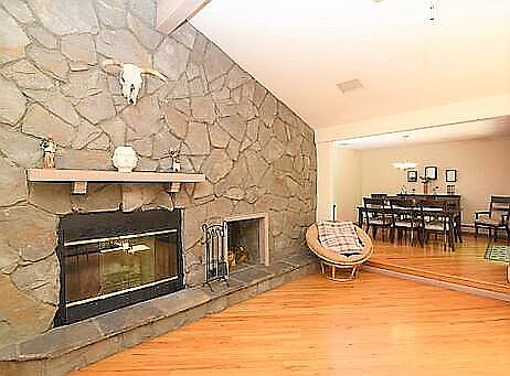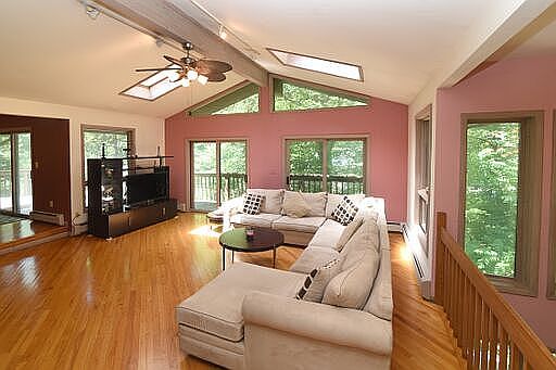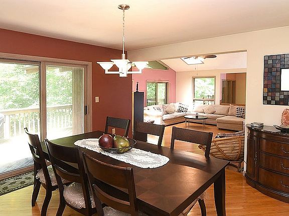 Sprawling California Ranch! Situated on a private acre with babbling brook offering a serene setting. Inside, you are welcomed into a spacious foyer with double closets, large Eat-in-Kitchen with lots of natural light, generous pantry and cabinet storage, Formal Dining Room wi/sliders to deck overlooking property & brook, sunken Living Room w/Floor-to-Ceiling Stone Firplace, Vaulted Celings w/Skylights & more sliders out to the deck. Lovely Hardwood Floors on the main living level. Huge Master-Bedroom w/Juliet Balcony & walk-in-closet. Updated Full Bath w/deep soaking/jetted tub, tumbled marble tile, separate shower, custom cabinetry & lots of storage! The main level is rounded out by an additional bedroom, powder room, laundry & 2-Car Garage. The finished walk-out lower level spans the length of the house and offers another full level of living space ... great for guests with an additional bedroom & office, game room, sliders to patio, and more storage!