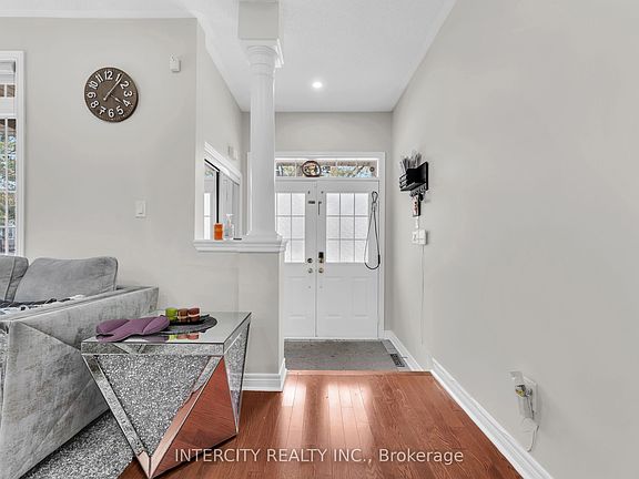 Hardwood floorUpgraded oak picketsCornes gas fireplaceGranite counter areaLarge windowsOpen layoutDecorative pillars