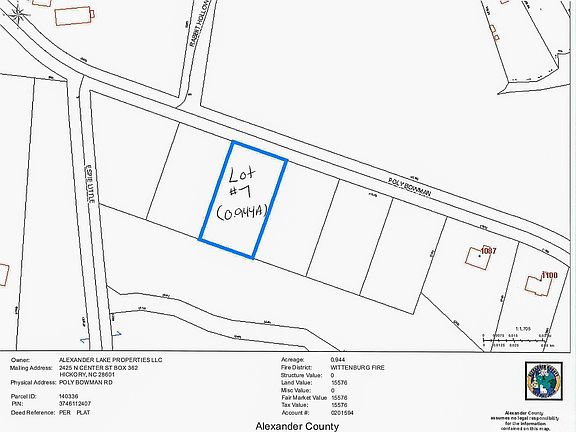 LOT #7 of "Anderson Lake Estates"/NC PIN#: 3746112407--newly developed lots. Enjoy a nice spacious lot offering 0.944 Acres. Public water available at street for buyer to tap onto, septic tank will be needed (buyer to do perc test with Alex. County Environmental Health). Restrictions (in Associated Docs) require size requirements to be 2100 sqft for a single story dwelling or no less than 2600 sqft for any 2 story dwelling--see DB: 666/PGS: 2383-2389 for all info. Setback requirements as per county zoning--40' front, 15' side, 40' rear - See PLAT Bk: 19/PG: 95 (in Associated Docs). Great location and close to Lake Hickory. Build your dream home here! *There is a farm nearby as well as chicken houses*