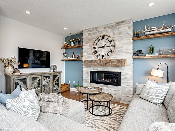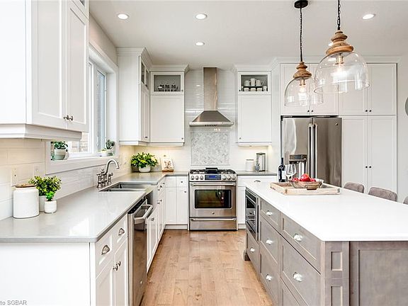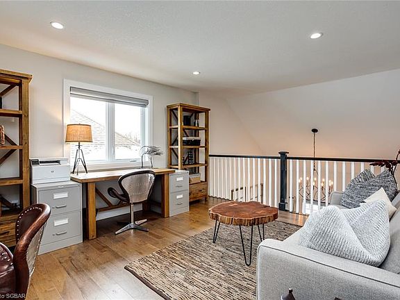 Stunning home in Collingwood's Pretty River Estates. Steps to the local trail system, Pawplar dog park, the Pretty River, Collingwood Community Tennis Club, local schools and parks. Originally Sunvale's model, the home was built to showcase the builder's best finishes. Upgrades include kitchen cabinets, island, appliances, countertops and sink, wood flooring throughout living spaces with upgraded carpet and under-padding in bedrooms and basement, premium window treatments, fully finished basement with 4-piece bath, media room and bedroom, second floor laundry with granite counters, upgraded bathroom vanities and fixtures, en suite shower and more. Fully fenced backyard with two-tier deck, hot tub and fire pit. Great curb appeal with landscaping and stone steps to a covered front porch. With 4 beds, 3 and 1/2 baths, multiple living spaces indoors and out, and a second floor office area, it meets the needs of many families . Contact for more details, features list, floor plans, extra photos, and your virtual or in-person tour.