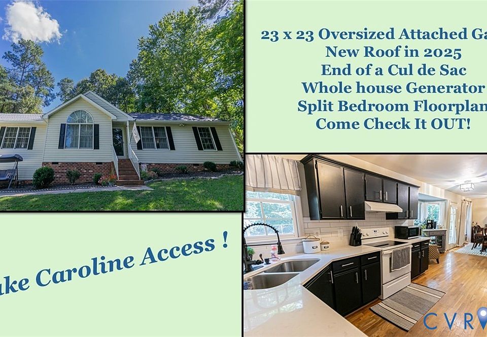 ONE STORY LIVING AT IT'S BEST IN BEAUTIFUL LAKE CAROLINE! SPACIOUS RANCH HOME WITH AN AWESOME OVERSIZED 23.1 X 23.4 SIDE LOAD GARAGE FOR YOUR BOATS & TOYS. NESTLED AT THE END OF A CUL DE SAC WHICH BACKS UP TO WOODED AREA IN THE REAR - LOTS OF PRIVACY WITH NICE FRONT/REAR YARD. SPLIT BEDROOM FLOOR-PLAN WITH KITCHEN-DINING-LIVING AREA COMBINED. WASHER & DRYER & ALL APPLIANCES CONVEY. *** NEW ROOF *** HVAC ** ONE YEAR OLD, NEW COUNTERTOPS & BACKSPLASH & WHOLE HOUSE GENERATOR TOO. THIS ADORABLE HOME & IS MOVE IN READY! AMENITIES: 2 SANDY BEACHES, CLUBHOUSE, POOL, TENNIS, PICKLEBALL, BASKETBALL, RECREATION ACTIVITIES LIKE CONCERTS ON THE BEACH - MOVIES ON THE BEACH, BOAT PARADES & MORE! WEEKLY FISHING TOURNAMENT, SWIM, KAYAK, WATER SKI, WAKEBOARD & JET SKIING TOO. LAKE CAROLINE IS JUST OFF I-95 BETWEEN ASHLAND & FREDERICKSBURG PERFECT FOR COMMUTERS ALL AROUND. CLOSE TO PENDLETON GOLF, WINERIES, LIBRARY, YMCA, COMMUNITY THEATER, FARMERS MARKET, SHOPPING. NOT FAR FROM KINGS DOMINION & THE NEW KALAHARI WATER PARK COMING SOON! COME CHECK IT OUT TODAY !