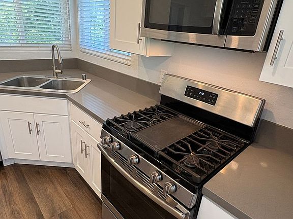 * Spacious kitchen features white wood shaker cabinetry, white quartz countertops, stainless steel appliances, room for small table, recessed lighting and a built-in alcove area with quartz counter.