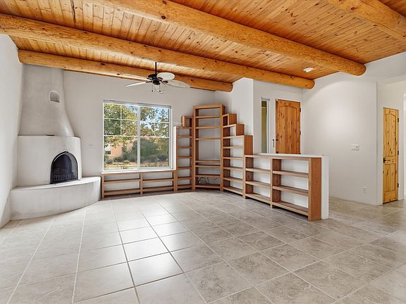 Step inside and be greeted by a stunning living room featuring a classic viga ceiling with latilla accents and custom built-in book shelving, creating a perfect blend of character and functionality. The open-concept living and dining area offers a seamless flow, ideal for entertaining or relaxing in style.