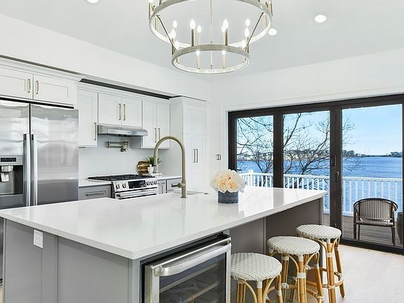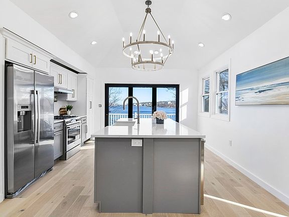 Direct Waterfront on Straits Pond.Step into this thoughtfully renovated 3 bdrm 2.5 bth home w/ stunning views,bright open floor plan & hardwood floors throughout. The beautiful kitchen w/ vaulted ceilings,custom cabinetry,large center island,quartz countertops,hidden walk-in pantry & Bosch appliances is perfect for entertaining & filled with natural light.Completing the space is a modern folding glass wall to a deck with gorgeous views extending the living space to the outdoors.In addition,the first floor includes a separate home office or flex space & half bath.Second floor has two bedrooms,a full bath & the primary suite w/ private deck,charming barn door leading to a closet & impressive bathroom w/ soaking tub, double sinks & glassed shower.Enjoy kayaking, paddle boarding and endless sunsets from this quiet sanctuary right out your back door.Proximate to Gun Rock Beach,shops,restaurants,commuter rail & boat, this home is centrally located to all the surrounding area has to offer.