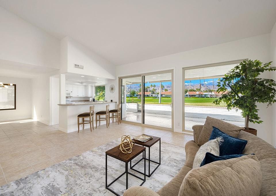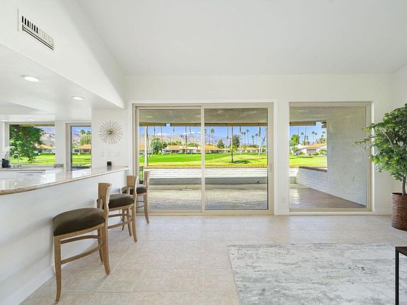Very desirable and rare to find '3000 Plan' on green, with deep south-west facing views. This plan is the largest plan in the community. The original plan had a large atrium, which was converted into a large family room with full bathroom; making this a rare to find 3 bedroom, 3 full bath unit. These spectacular views and prime location are rarely on the market. From the kitchen and living room you can see the San Jacinto mountain range, the large windows and sliders bring in lots of natural light. The living room features fireplace, high ceilings, and durable low e-glass windows and sliders. The condo was renovated for the sale, new -- kitchen cabinets, baseboards, paint, fixtures, recessed lighting, light figure to name some of the upgrades. All bedrooms are generously sized. Large private patio faces the beautiful greens, deep mountain views, and is set back from the road. Attached two-car garage and laundry room are also great features of this condo. Rancho Las Palmas 'RLP' CC is a very well kept golf course community, with golf & sports membership options. RLP residents receive incentives and discounts to the Omni Resort and Spa, which is known for great restaurants and Space Park water park. RLP CC offers 27 holes of championship Ted Robinson designed golf courses, 20 tennis courts, 8 pickle-ball courts, fitness facility and club house. Located in a prime location of Rancho Mirage, walking distance to The River, an upscale dining, shopping, & movie theater destination.