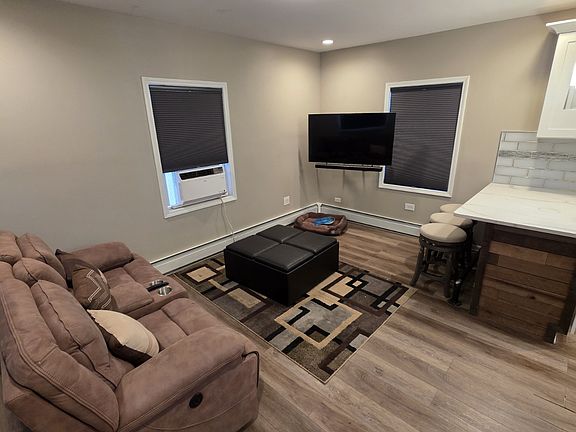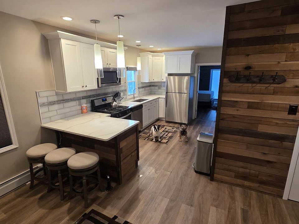 Fully furnished rental with high-speed Wi-Fi, all utilities included (gas, electric, water), and complimentary Prime Video and Netflix. Features a sound bar, two mounted flat-screen TVs in the primary bedroom, one flat-screen TV in the living room, a smart queen-size bed, a powered recliner in the living room, a full-size Maytag washer and dryer, and a jacuzzi bathtub. Enjoy a large wrap-around deck, a spacious wooded backyard, and private walking trails on 9 acres.