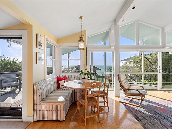 The temperature shifts, the air feels clearer, and the sunsets take your breath away. Flowering trees stretch their limbs out to welcome you as you’re serenaded by singing birds and distant crashing waves. Just ask anyone who lives in Lanesville, one of Gloucester’s delightful, coastal neighborhoods. Designed for seamless indoor-outdoor living, this 3-bed, 2-bath home at 7 Ships Bell Rd. features vaulted ceilings, hardwood floors, and walls of glass that frame Ipswich Bay. The open layout with sweeping ocean views includes a well appointed kitchen, a fireplaced living room with sliders to the wrap around deck, and a lower-level bedroom and full bath with walkout access. Enjoy kayaking from Lane’s Cove, fishing from the rocks, swimming in the quarry or simply relaxing. Be nurtured by this seaside dream, a rare mid-century gem with coastal flair.