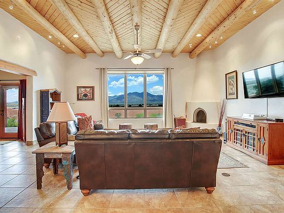 Spacious, beautifully appointed, 2329 sq ft, 3 bedroom, 2.5 bath home on a spectacular 2.25 acre lot that embraces the mountain and territorial views. Lovely landscaped path invites you to the walled and gated front courtyard which welcomes you into the gracious entry hall. Open great room/living room with kiva fireplace and an enormous picture window that frames Taos Mountain perfectly. Dining area has glass doors for access to the covered back patio. Open kitchen with work/dining counter, quality stainless appliance, pantry, quality cabinetry and granite counter tops. Half bath for guests and a spacious laundry room are conveniently located off the kitchen area. Extra large master suite, with the same big views, features a kiva fireplace, walk in closet and spacious, 5 piece bath. Two guest rooms (one with no closet but would also make a great office) share another full bath. Enjoy the great views from the well landscaped walled and gated courtyard. Double car attached garage PLUS an additional 2 car garage!