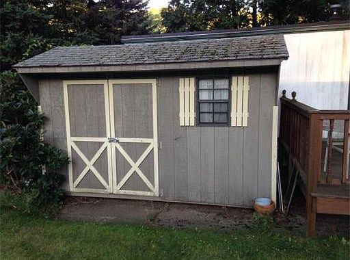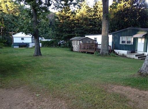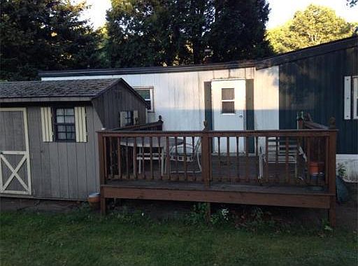 Home located on private dead end street. Beautiful lot with plenty of land for garden and outdoor activities. Deck located just off the side of the home. Beautiful storage shed with electrical outlets. Great for a workshop or for plenty of storage space. Home has 2 bedrooms and 1 1/2 baths. Cathedral ceilings in living room. Open living room and kitchen. 16,500 park fee included in the price of home. NOT an over 55 park! New windows and furnace. Needs only cosmetics.