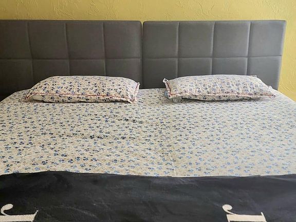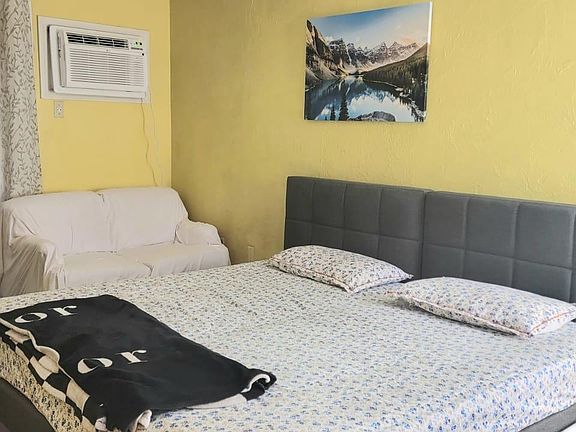This bright and well-maintained unit features a versatile sleeping arrangement with two twin beds that can be easily combined to form a king-size bed, making it ideal for singles, couples, or traveling professionals. The bedroom also includes lamps, ample lighting, and comfortable furnishings for a restful stay.