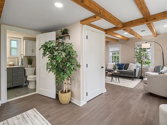 This recently renovated home features an open floor plan filled with natural light, highlighted by charming wood-beamed ceilings and a seamless flow through the living room, dining area, kitchen, bedroom, and bathroom.