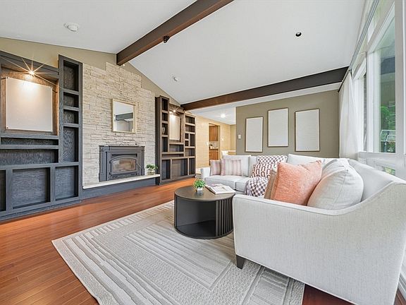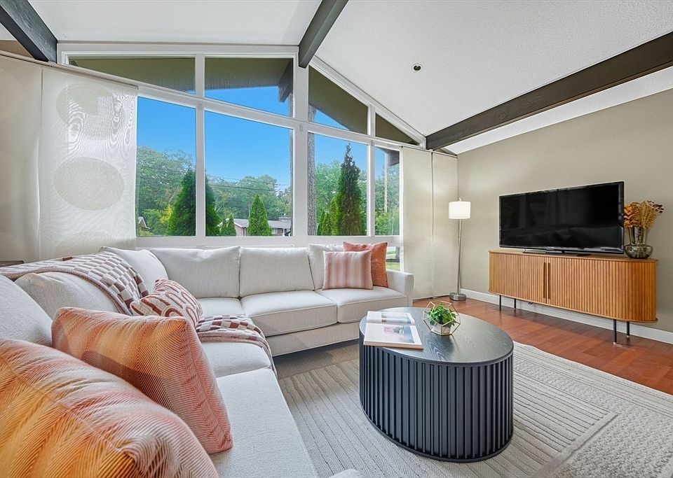 Welcome to this contemporary modern ranch! Step inside through a beautiful custom wood entry door into a sunken living room with vaulted ceilings, a full wall of custom shelving, and dramatic floor-to-ceiling windows that bring in natural light. The kitchen stands out with rich walnut cabinetry, granite counters, and a sleek white granite island, with direct access to the deck, ideal for summer dining and entertaining. The family room continues the open, modern feel with high ceilings, a pellet stove, and sliders to an oversized entertainment deck. All bathrooms have been stylishly remodeled. The finished lower level is a true bonus, offering flexible living space, guest quarters, and plenty of room for everyone. Additional highlights include a two-car oversized garage, large laundry room, and inviting outdoor space. Major updates have been completed within the last few years making this turn-key and ready to move in!