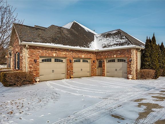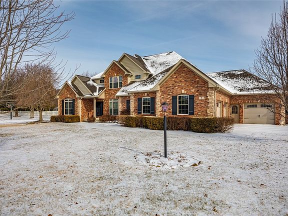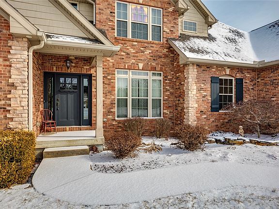 This stunning custom-built executive home offers 6586 sq. ft. of luxurious living space, featuring 5 bedrooms, 4.5 baths, and a full basement. Designed with elegance and functionality in mind, the home boasts an attached 3-car garage and an exterior blend of brick, stone transoms, and vinyl, creating a timeless curb appeal. Step onto the welcoming front porch and into the grand foyer, leading to a formal dining room, office, and spacious living room with expansive windows that highlight the covered back porch and overlooks the 1.2 acre backyard. The gourmet kitchen is a chef’s dream, complete with a large seating island, deep rich granite countertops, copper sink, wine cooler, pantry, recessed refrigerator with a cabinet front, built-in oven, microwave, and warming drawer. The charming breakfast nook, surrounded by windows, floods the space with natural light and creates relaxing setting. The adjacent gathering room, separated by a knee wall, features a stone fireplace flanked by built-in shelving and storage cabinets, creating a cozy yet sophisticated atmosphere. The main floor master suite is a private retreat, offering a spa-like bathroom with dual vanities, walk-in closet, a luxurious custom spa shower with rain head and side jets, also is corner soaking tub with pretty window for relaxation. The main level offers a half bath, laundry room, and a well-designed work station area with organizational cubbies that leads to the 3 car garage. Upstairs, you’ll find three spacious bedrooms, each with walk-in closets, along with two full baths – one being a Jack and Jill bathroom with oversized walk in shower. The expansive full basement is perfect for entertainment, featuring a game room, den, recreation room with sunken floor, a private bedroom, full bathroom, storage room, and industrial finished exercise/mechanical room. The covered back porch enhances the home’s indoor-outdoor flow, making it an entertainer’s paradise. Step outside to a beautifully designed stamped concrete patio with a large brick fireplace, perfect for outdoor gatherings.