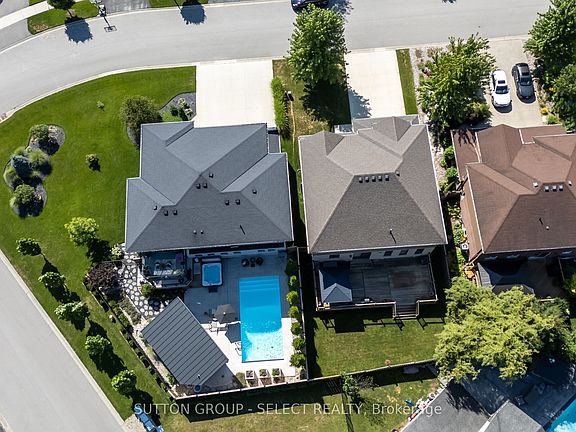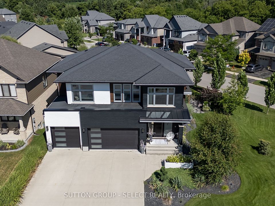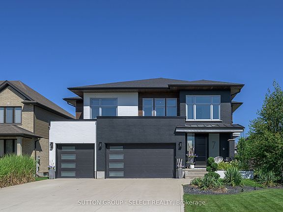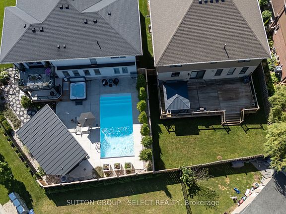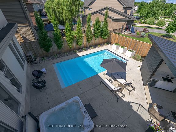 Luxury living redefined 10 min west of London. Tucked onto a quiet crescent, this extraordinary executive residence offers an enviable lifestyle with a premium lot and show-stopping resort-style backyard anchored by a heated saltwater pool with state -of-the-art automated safety cover (~25k), and year-round cabana retreat. Curated with smart home technology, every detail reflects thoughtful design and elevated finish. Modern curb appeal impacts with crisp black-and-white contrast, manicured landscaping, and a triple bay heated garage (fully insulated/epoxy flooring) plus six-car driveway. A dramatic two-storey foyer with glass-railed floating staircase and full-height windows creates a luminous entry. Wide-plank White Oak hardwood draws you to the airy great room and a sleek two-sided gas fireplace with a floor-to-ceiling stone surround that also serves the outdoor living space. The chef's kitchen is striking and high-function, showcasing stone surfaces, a 4-seat island with wine fridge, programmable lighting, and premium stainless appliances. A dedicated home office, sleek powder room, and crisp designer lighting/paint tones elevate the main floor ambiance. Upstairs, the primary suite is a true retreat with a herringbone feature wall, tray ceiling, walk-in closet with custom built-ins, automated shades & a private glass-railed balcony. The spa-like ensuite offers radiant in-floor heat, luxe finishes. Three additional bedrooms each with hardwood flooring, solid-core doors, and motorized shades share the level with a well-appointed laundry room. The fully finished lower level offers an expansive recreation area, full bathroom + a home gym with glass enclosure and high-end audio. Outside, the cabana is an entertainers dream with integrated lighting, wet bar, beverage fridges, and 3-piece bathroom all framed by lush black cedar privacy hedging. A seamless blend of technology & design just minutes from Komoka Provincial Park & 11 km of trails along the Thames River.