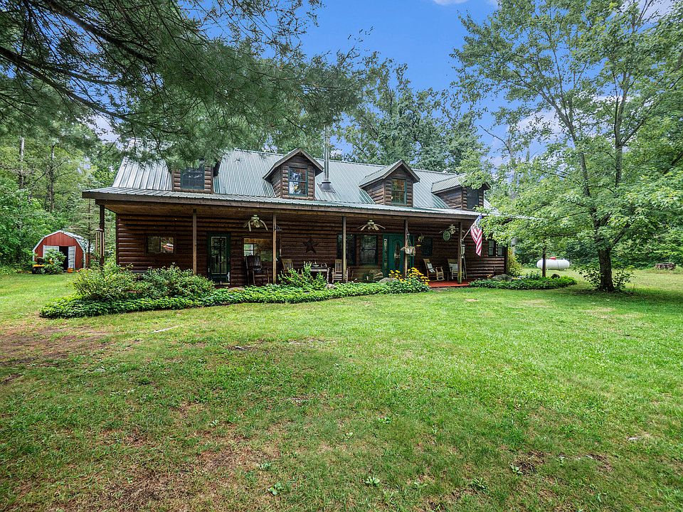 Escape to your own private paradise with this stunning 2.22-acre log cabin family retreat, nestled at the end of a quiet dead-end road and bordering hundreds of acres of state land. Built in 2003, this 2,339 sq. ft. home offers 4/5 potential bedrooms and 2 full baths, blending rustic charm with modern comfort. The home's inviting layout features a spacious main floor with a large kitchen w/island, open to dinning room and living room. A gorgeous full-length covered front porch, and a generous back patio overlooking the Little Manistee River. The family room boasts a custom wet bar, perfect for entertaining, while the living room's vaulted ceilings are open to a catwalk connecting two upstairs bedrooms. The primary suite offers a large en-suite bath with Jacuzzi whirlpool tub and walk-in closets. Step outside to enjoy two firepits (one by the home, one by the river), a low-bank walkout to a beautiful stretch of this Blue Ribbon trout stream, and direct access to the ORV trail system right from your driveway. A highlight of the property is the massive 30' x 44' heated and insulated barn, complete with oversized overhead doors and a finished man-cave/recreation spaceideal for hobbies, gatherings, or overflow guest accommodations.