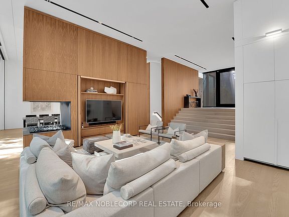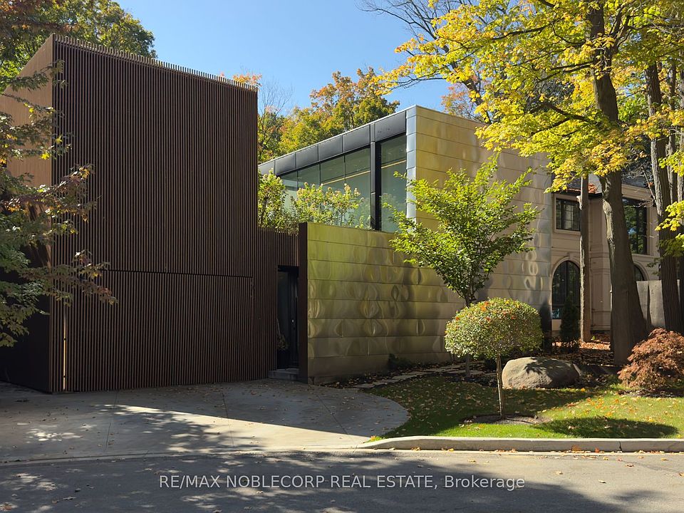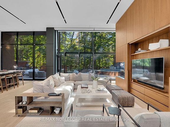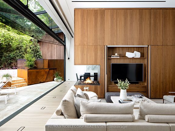 Inspired by the precision and versatility of a Swiss Army knife, this internationally award-winning, architecturally significant residence offers over 6,000 sq.ft. of luxury living on a private, forested ravine cul-de-sac. Designed with dynamic multi-level functionality, its dual wings are connected by a sleek glass bridge and clad in a striking blend of reflective titanium, simulated walnut, and rich black Palisade panels. A descending entrance introduces the main living area where a panoramic fireplace anchors open-concept spaces extending to the outdoors through a dramatic, folding glass hangar door. Every detail is engineered for seamless living and entertaining from the indoor/outdoor dining areas, hidden wine closet, and wet bar to the amenity-rich lower level featuring a full kitchen, gym, and theatre. The primary suite is a true retreat with his-and-hers closets, a spa-inspired ensuite, and a private balcony overlooking the ravine. Outside, a tiered infinity pool, integrated outdoor kitchen, and fire table are enveloped by nature, creating a breathtaking, resort-like oasis.