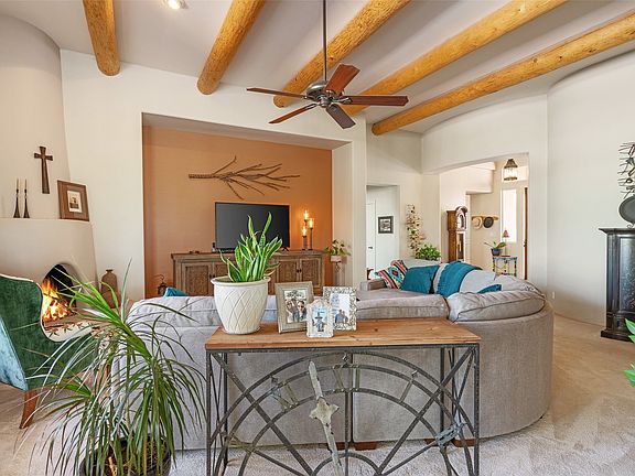 Additional upgrades made during this owner's tenure include a new boiler and evaporative cooler, new carpeting, fresh interior paint, new ceiling fans and custom lighting, plus plantation shutters throughout—both beautiful and energy-efficient. Exterior wise, the stucco was also recently replaced and refreshed and the rear yard has been enhanced with new rock landscaping, pathways, and fruit trees, creating a peaceful outdoor escape. The slightly oversized garage is another welcome bonus with additional storage shelves. Located in the desirable Village at Rancho Viejo, this community offers miles of paved walking trails, multiple parks, sensible covenants, friendly neighbors, and convenient access to shopping and restaurants. Roughly 12 miles to the Santa Fe Plaza, this fantastic home delivers!