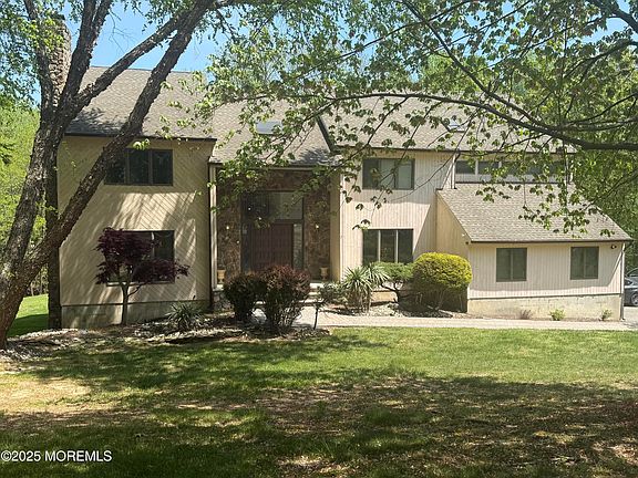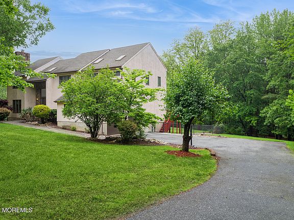 Contemporary Home in Sought-After Holmdel! Nestled on a quiet cul-de-sac block and backing to serene woods, this spacious contemporary-style home offers privacy and a picturesque natural setting. A paver walkway leads to a double-door entry and a two-story foyer with marble floors. The formal living room features a cozy fireplace and opens through French doors to a private office overlooking the wooded yard ideal for working from home. The expansive two-story great room boasts a dramatic stone fireplace, hardwood floors, and access to the rear deck .Designed for entertaining, the oversized eat-in kitchen includes newer double ovens, dual cooktops, a center island, and direct deck access. The kitchen flows seamlessly into a generously sized dining room with hardwood floors. The first floor also features a newly renovated full bath and a convenient laundry area. Upstairs, you'll find 4 bedrooms with newer installed hardwood flooring. The primary suite with a cathedral ceiling, a spacious sitting area, two walk-in closets, and bath with double sinks, a separate shower, and a whirlpool-style tub plus French door to deck. The finished walkout basement offers high ceilings, ceramic tile flooring, recessed lighting, a full bath, and sliding doors to a paver patio perfect for additional living or entertaining space. House presents the perfect opportunity to design and customize a residence tailored to your lifestyle.