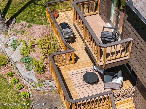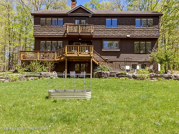 Wake up to serene, wooded views, sip coffee on the covered back deck, and step into a home thoughtfully renovated for modern living. The chef's kitchen balances form and function with Thermador WiFi-enabled appliances, high-end Black Oak and White FORM cabinetry imported from Germany, a center island, and a built-in beverage bar—perfect for effortless entertaining. The open-concept living area features soaring ceilings, oak flooring, and a sunken, cozy den anchored by a wood-burning fireplace—adding year-round warmth and character. Upstairs, the primary suite is a true retreat with a spa-inspired walk-in tile shower, double vanity, and private laundry. Two spacious guest bedrooms, a dedicated office, and a beautifully designed guest bath appointed with Kohler fixtures offer flexibility for hosting, working remotely, or simply relaxing. Step outside to a bluestone patio ideal for al fresco dining or evenings under the stars. The walk-out lower level includes a fitness room and second laundry area, while a separate potting shed with an overhead garage door makes garden projects a breeze. An oversized two-car garage provides ample storage for vehicles and gear. Arrive in style via a circular pebble driveway, where a tranquil water feature sets the tone for the peaceful escape that awaits. Perfectly positioned in the Hudson Valley and located just minutes from the Village of Catskill, Palenville, Saugerties, Hudson, and Hunter Mountain; you're ideally situated to enjoy the best of the region—from hiking and skiing to exploring artisan shops and savoring farm-to-table cuisine. All with the privacy and calm of a tucked-away retreat.