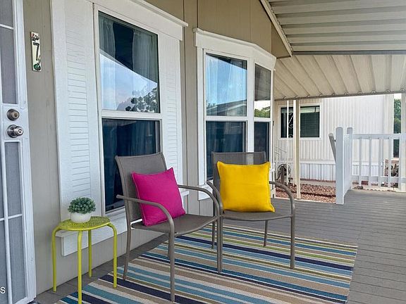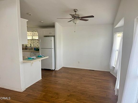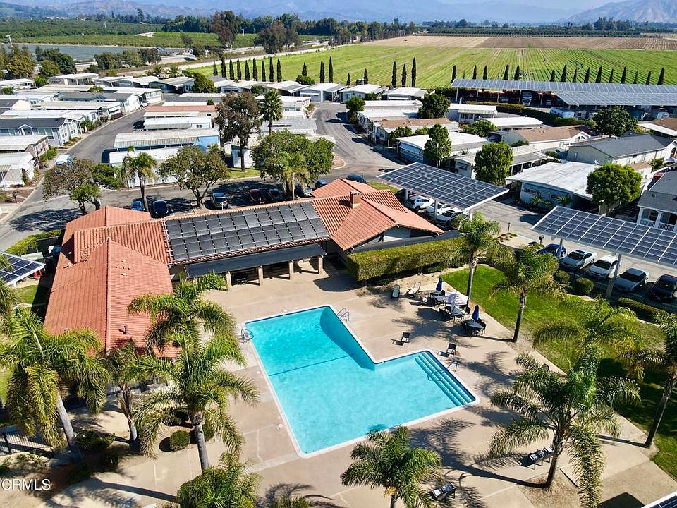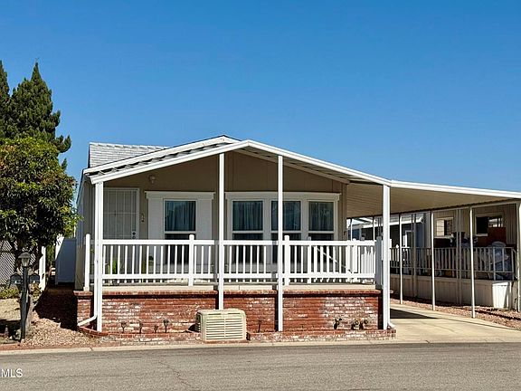 Welcome to 7 Wisteria Way, a well-maintained manufactured home featuring a new Certainteed Landmark Solaris Cool Roof (installed July 2025) and a fantastic location within a desirable age-restricted community. Natural light streams through well-placed windows, highlighting the airy living spaces and easy-care hard-surface flooring throughout (with plush carpet in the bedrooms). The primary suite includes a spacious closet and en suite bath with abundant storage and an easily-accessible shower. The hall bath has a shower and tub combination. Keep cool with ceiling fans in both bedrooms, the family room and the dining area. The light kitchen opens to the dining area with a cute counter for possible seating or serving too. Enjoy the inviting shady front porch with beautiful used brick detail--perfect for relaxing with a book, entertaining or connecting with neighbors in this vibrant, active community. A large storage shed with shelving offers added convenience, while the extended carport can accommodate longer vehicles or two cars parked tandem. Thoughtfully appointed, this is a wonderful place to call home! The community itself has a sparkling pool surrounded by a grassy lawn, palm trees, picnic tables, and courts for shuffle ball and corn hole. There is a covered hot tub as well as an event space. East Ventura combines the quiet atmosphere of agricultural fields mingled with residential neighborhoods including parks and schools. Trailheads at Harmon Canyon to area hiking are found off of Foothill Road. Multiple golf courses are nearby. For dining, shopping and entertainment, the Collection in Oxnard is 5.5 miles away, while Downtown Ventura's arts and cultural corridor is 10 miles away. For days at the beach, sea glass collecting or enjoying the sunset over the Pacific, the fastest route is to take the nearby 126 to the Seaward exit off the 101 - a 9 mile ride. Whether for a full-time residence, an easy 'lock and leave' for the frequent traveler or as a cooler climate weekend home, Ventura has much to offer!